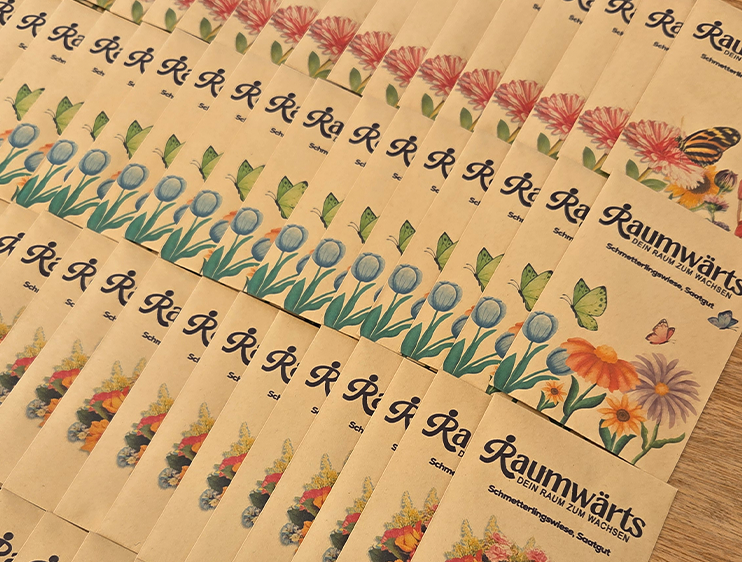 Für Raumwärts durften wir ein umfangreiches Branding-Paket entwickeln, das den Charakter des Unternehmens visuell transportiert: offen, herzlich und verbindend. Den Grundstein legte ein einzigartiges Logo, das sowohl Wiedererkennbarkeit schafft als auch das Community-Gefühl von Raumwärts widerspiegelt. Aufbauend darauf entstand eine Produktwelt mit liebevollen Details und hohem Wiedererkennungswert: individuell gestaltete TicTacToe-Spiele, klassische Einkaufstaschen, Samen-Info-Karten, Aufkleber und passende Samentütchen, die symbolisch das „Wachsen“ der Gemeinschaft betonen.